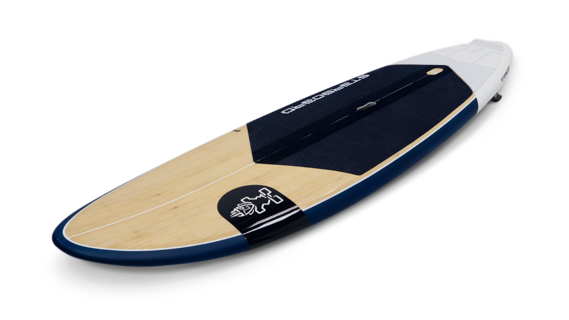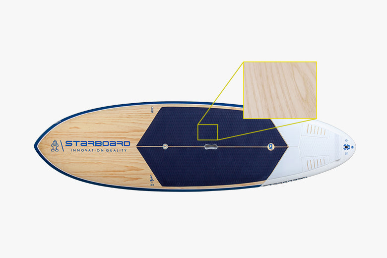 The Starlite construction features an ultra-durable, scratch and impact resistant woven rail protection and full wood deck. The rail Azure and Charcoal rail band is stronger for paddle dents and impact. The full deck has 0.6mm Australian pine wood, which is sandwiched between 2 glass outer skins, increasing the overall total breakage strength. The deck and bottom now feature twin stringer deck and bottom, positioned close to the rail for increased breakage strength.