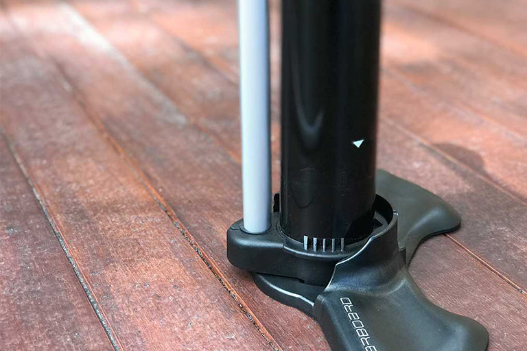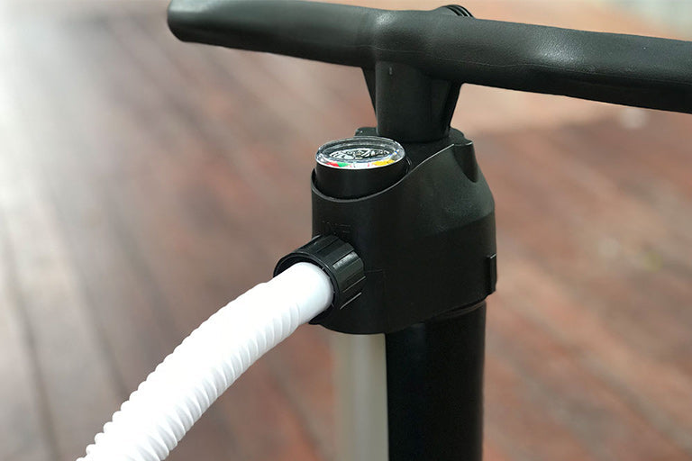 Fixed hose and manometer position when inflating. 10% more efficient thanks to the redesigned piston and outside tube for the air outlet. Precise angled palm grip for comfortable and easier pumping. Double and single action. Wider removable foot base increases stability when pumping. Upcycled fishing nets in the base and handle.